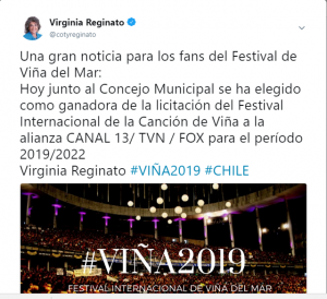 Es así como hace un par de días y de forma oficial la alcaldesa de Viña del Mar Virginia Reginatto comunico por las redes sociales específicamente Twitter que había nueva alianza organizadora del Festival Internacional de la cancón de Viña del Mar