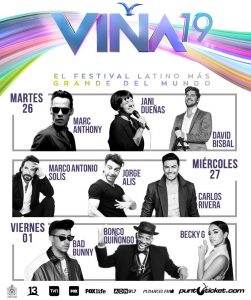 Ademas te recordamos que viña 2019 será transmitido por Canal 13, TVN, FOX y por las radios oficiales pertenecientes a Iberoamerican radio.