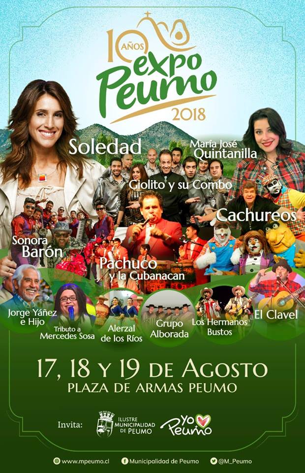 El dia miercoles 25 de julio se dio a conocer toda la información y la parrilla artistica correspondiente a la EXPO PEUMO 2018 conocida inicialmente como la expo palta y actualmente es reconocida como el evento mas importante del valle del cachapoal, por la calidad de su produccion tanto en los stand como en el show artistico y por supuesto con un impecable trabajo comunicacional que se realiza a nivel nacional, visitando medios de comunicacion tanto de radios como television.