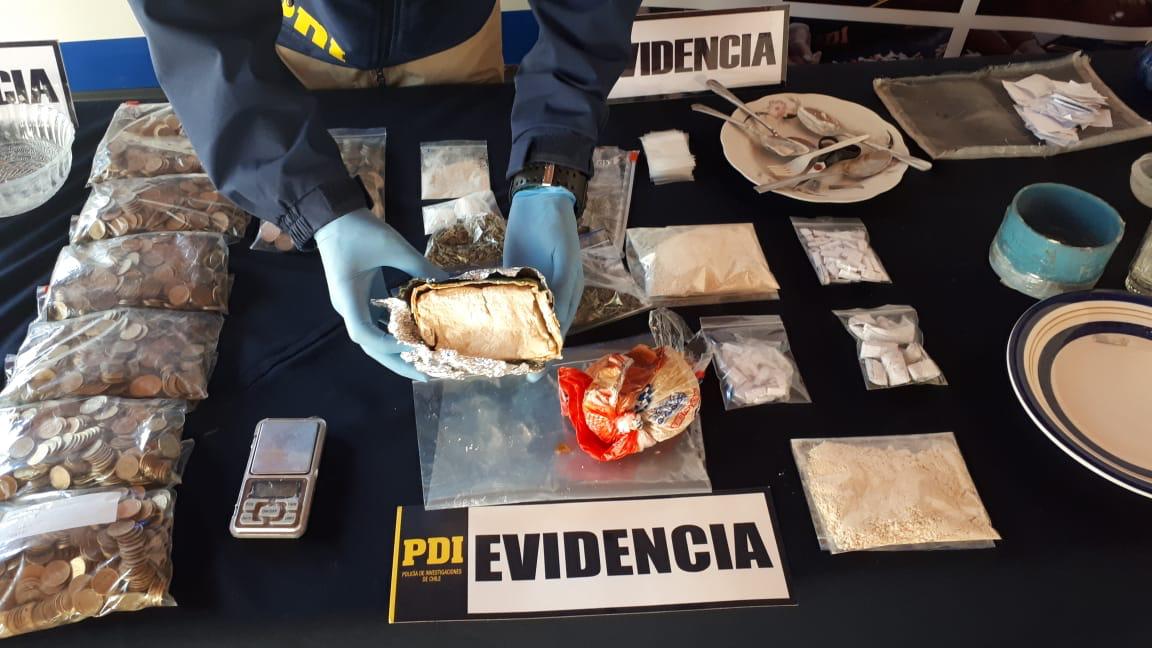 Por lo anterior, los investigadores policiales especializados efectuaron una serie de diligencias, que permitieron establecer que al interior de dos departamentos, un clan familiar estaría comercializando drogas en pequeñas cantidades, donde el fiscal de turno en virtud a la evidencia obtenida por los detectives, gestionó ante el Juzgado de Garantía, las respectivas entradas y registros a ambos domicilios, logrando la incautación de 975,1 gramos de cocina base, 21 gramos de Clorhidrato de cocaína, 150 gramos de cannabis procesada, la suma de 568 mil 960 pesos, y un vehículo marca Toyota, modelo Yaris, siendo detenidas seis personas por el delito de microtráfico de drogas.